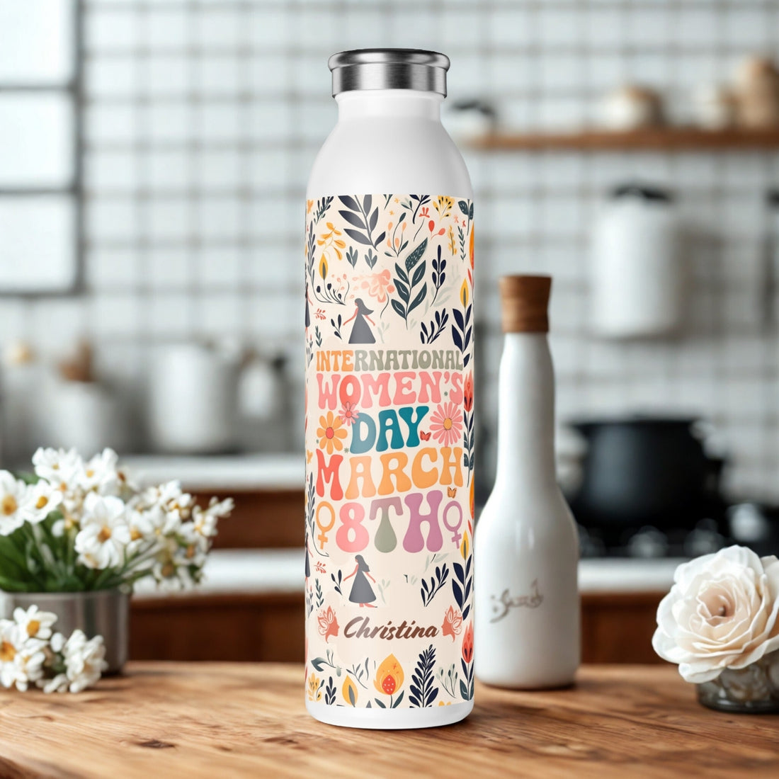 International Women's Day Personalized Slim Water Bottle – Floral Design, Eco-Friendly, Custom Message 🌸✨ Celebrate...