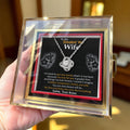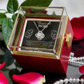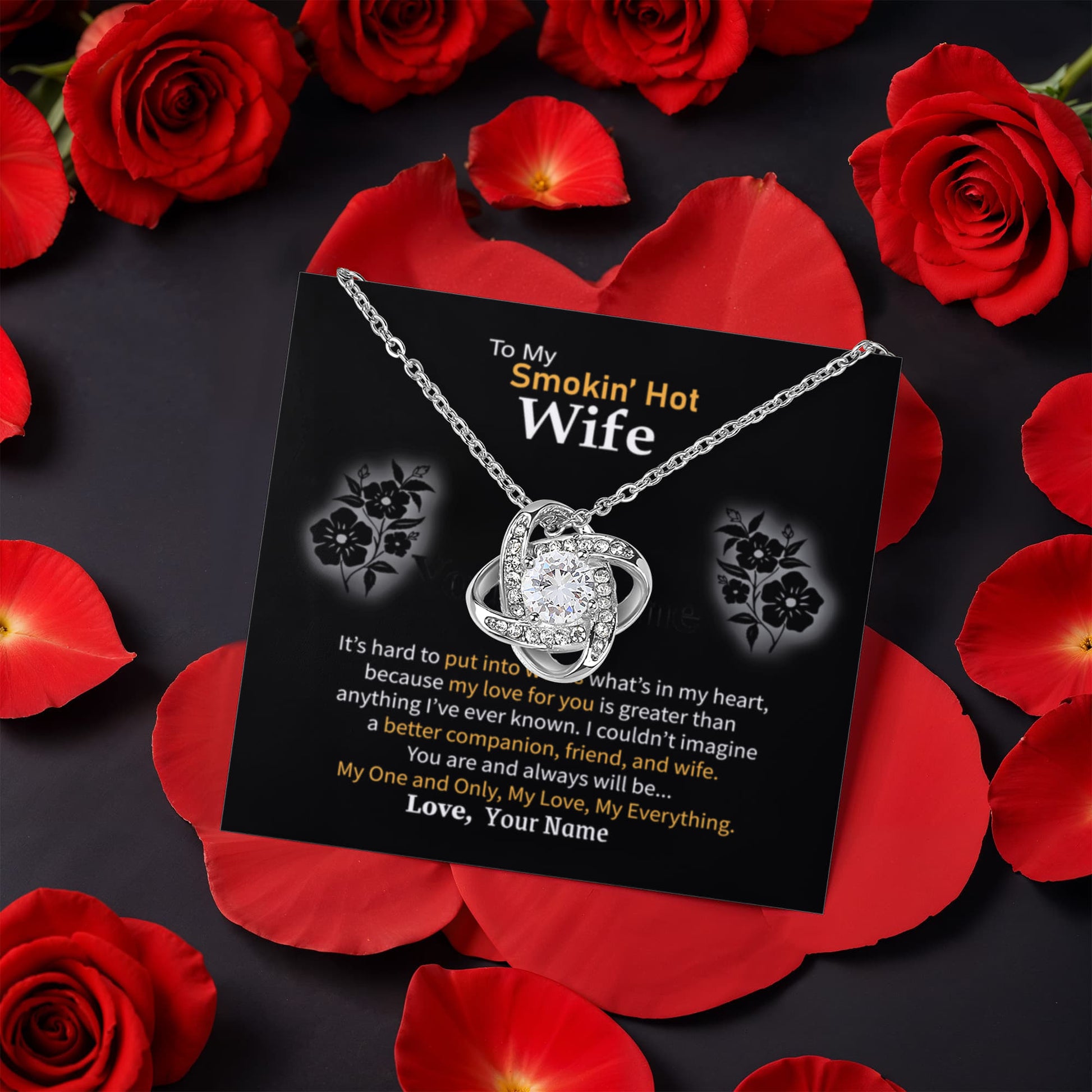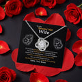 Show your wife how much she means to you with the Personalized Love Knot Necklace. This stunning pendant, adorned with cubic zirconia crystals, symbolizes your unbreakable bond. The luxurious Rotating Rose Box, featuring a preserved rose that never fades, adds a magical touch. Personalize this heartfelt gift with a custom name on the message card and a custom message to make it uniquely hers.